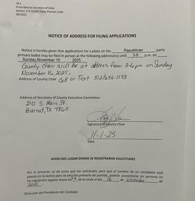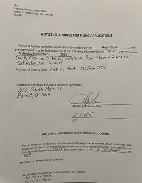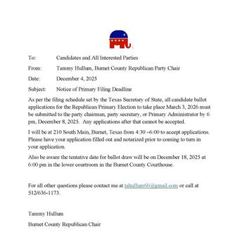 The Burnet County Republican Party will hold a CEC Meeting on Monday September 22, 2025 at 6:00 PM. The location will be the Burnet Agrilife Building, 607 North Vandeveer, Suite 100